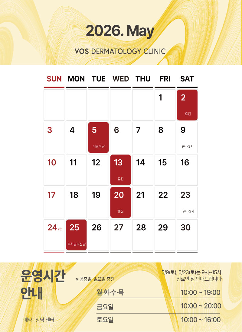 보스피부과 2026년 5월 진료일정 공지사항 | 2026.04.20 보스피부과 2026년 5월 진료일정입니다.내원에 참고하시기 바랍니다.감사합니다. 📞02-515-5515 비용문의 바로가기네이버예약 바로가기